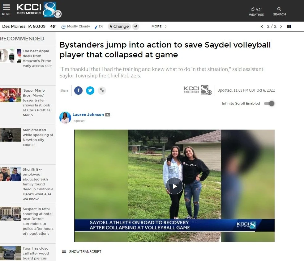 Take a look at this awesome article by KCCI. https://www.kcci.com/article/iowa-off-duty-firefighter-helps-save-saydel-volleyball-player-that-collapsed-at-game/41551005